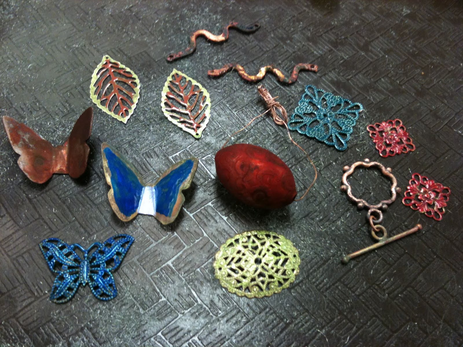 Last Sunday I had a class in surface decoration of metals. It looks beyond liver of sulfur for adding color to metals. We had a messy good time. We got to try dye oxide patinas, flame patinas. Gilder's Paste, nail polish, and acid patina (Midas Green). I think we could probably have an all day class on any one of these techniques! I'm really excited about the dye oxide patinas for my own work. With all of the methods, prep is crucial. If you spend enough time cleaning and prepping the metal, you'll have better, longer lasting results. I hope to do another patina class soon! Somehow, I didn't get a picture of Julie's pieces, which is too bad because she gave up her day to help me out with the class and I really appreciate! Thanks Julie!